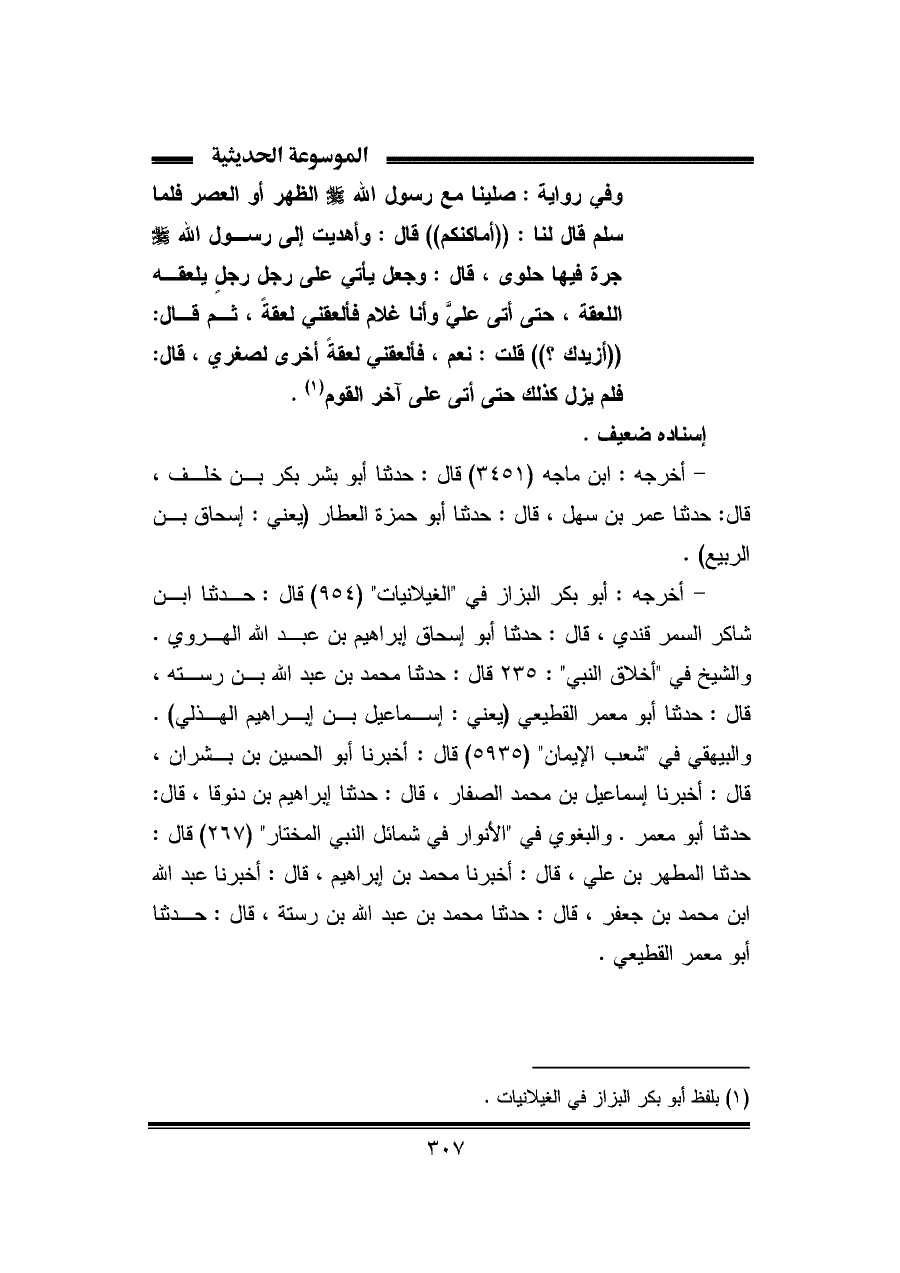 - أخرجه: أبو بكر البزاز في "الغيلانيات" (٩٥٤) قال: حدثنا ابن شاكر السمرقندي، قال: حدثنا أبو إسحاق إبراهيم بن عبد الله الهروي. والشيخ في "أخلاق النبي": ٢٣٥ قال: حدثنا محمد بن عبد الله بن رسته، قال: حدثنا أبو معمر القطيعي (يعني: إسماعيل بن إبراهيم الهذلي). والبيهقي في "شعب الإيمان" (٥٩٣٥) قال: أخبرنا أبو الحسين بن بشران، قال: أخبرنا إسماعيل بن محمد الصفار، قال: حدثنا إبراهيم بن دنوقا، قال: حدثنا أبو معمر. والبغوي في "الأنوار في شمائل النبي المختار" (٢٦٧) قال: حدثنا المطهر بن علي، قال: أخبرنا محمد بن إبراهيم، قال: أخبرنا عبد الله بن محمد بن جعفر، قال: حدثنا محمد بن عبد الله بن رستة، قال: حدثنا أبو معمر القطيعي.