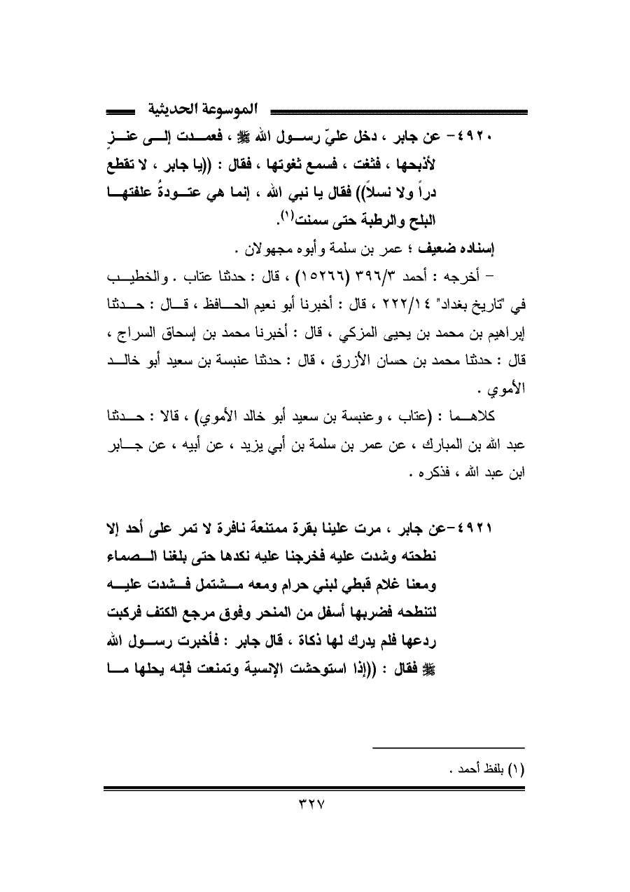 ٤٩٢٠ - عن جابر، دخل عليّ رسول الله - صلى الله عليه وسلم -، فعمدت إلى عنزٍ لأذبحها، فثغت، فسمع ثغوتها، فقال: ((يا جابر، لا تقطع درًا ولا نسلًا)) فقال يا نبي الله، إنما هي عتودةٌ علفتها البلح والرطبة حتى سمنت (¬١).