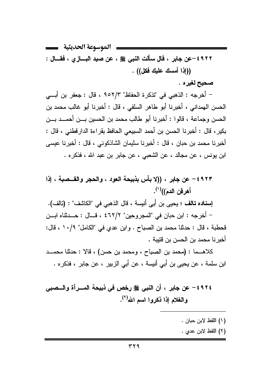 - أخرجه: الذهبي في "تذكرة الحفاظ" ٣/ ٩٥٢، قال: جعفر بن أبي الحسن الهمداني، أخبرنا أبو طاهر السلفي، قال: أخبرنا أبو غالب محمد بن الحسن وجماعة، قالوا: أخبرنا أبو طالب محمد بن الحسين بن أحمد بن بكير، قال: أخبرنا الحسن بن أحمد السبيعي الحافظ بقراءة الدارقطني، قال: أخبرنا محمد بن حبان، قال: أخبرنا سليمان الشاذكوني، قال: أخبرنا عيسى بن يونس، عن مجالد، عن الشعبي، عن جابر بن عبد الله، فذكره.