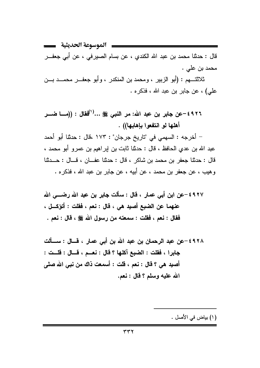 ٤٩٢٧ - عن ابن أبي عمار، قال: سألت جابر بن عبد الله رضي الله عنهما عن الضبع أصيد هي، قال: نعم، فقلت: أتؤكل، فقال: نعم، فقلت: سمعته من رسول الله - صلى الله عليه وسلم -، قال: نعم.