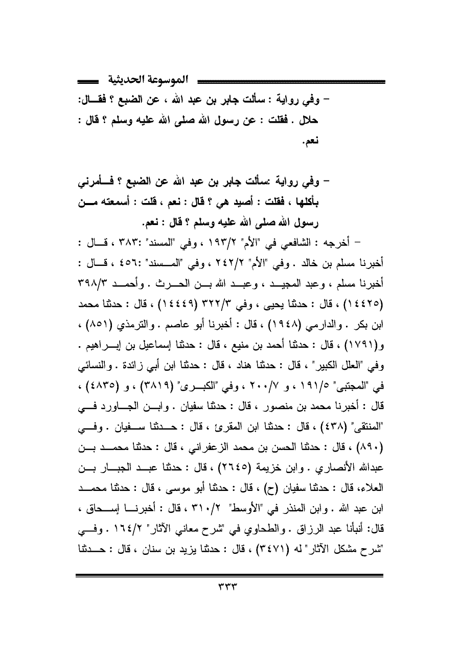- وفي رواية: سألت جابر بن عبد الله عن الضبع؟ فأمرني بأكلها، فقلت: أصيد هي؟ قال: نعم، قلت: أسمعته من رسول الله صلى الله عليه وسلم؟ قال: نعم.