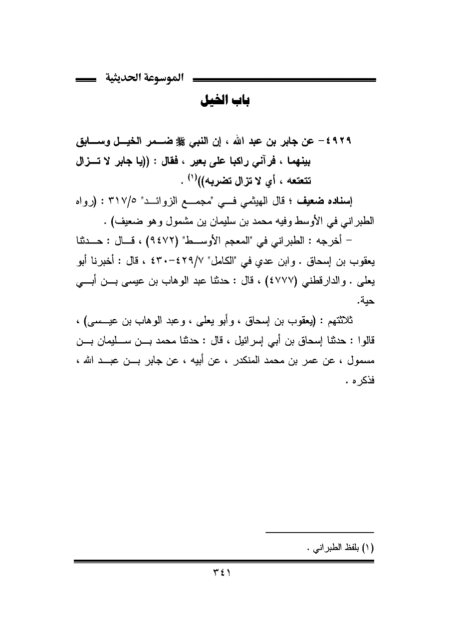 ٤٩٢٩ - عن جابر بن عبد الله، إن النبي - صلى الله عليه وسلم - ضمر الخيل وسابق بينهما، فرآني راكبا على بعير، فقال: ((يا جابر لا تزال تتعتعه، أي لا تزال تضربه)) (¬١).