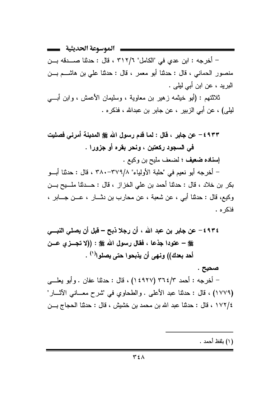 ٤٩٣٣ - عن جابر، قال: لما قدم رسول الله - صلى الله عليه وسلم - المدينة أمرني فصليت في السجود ركعتين، ونحر بقره أو جزورا.