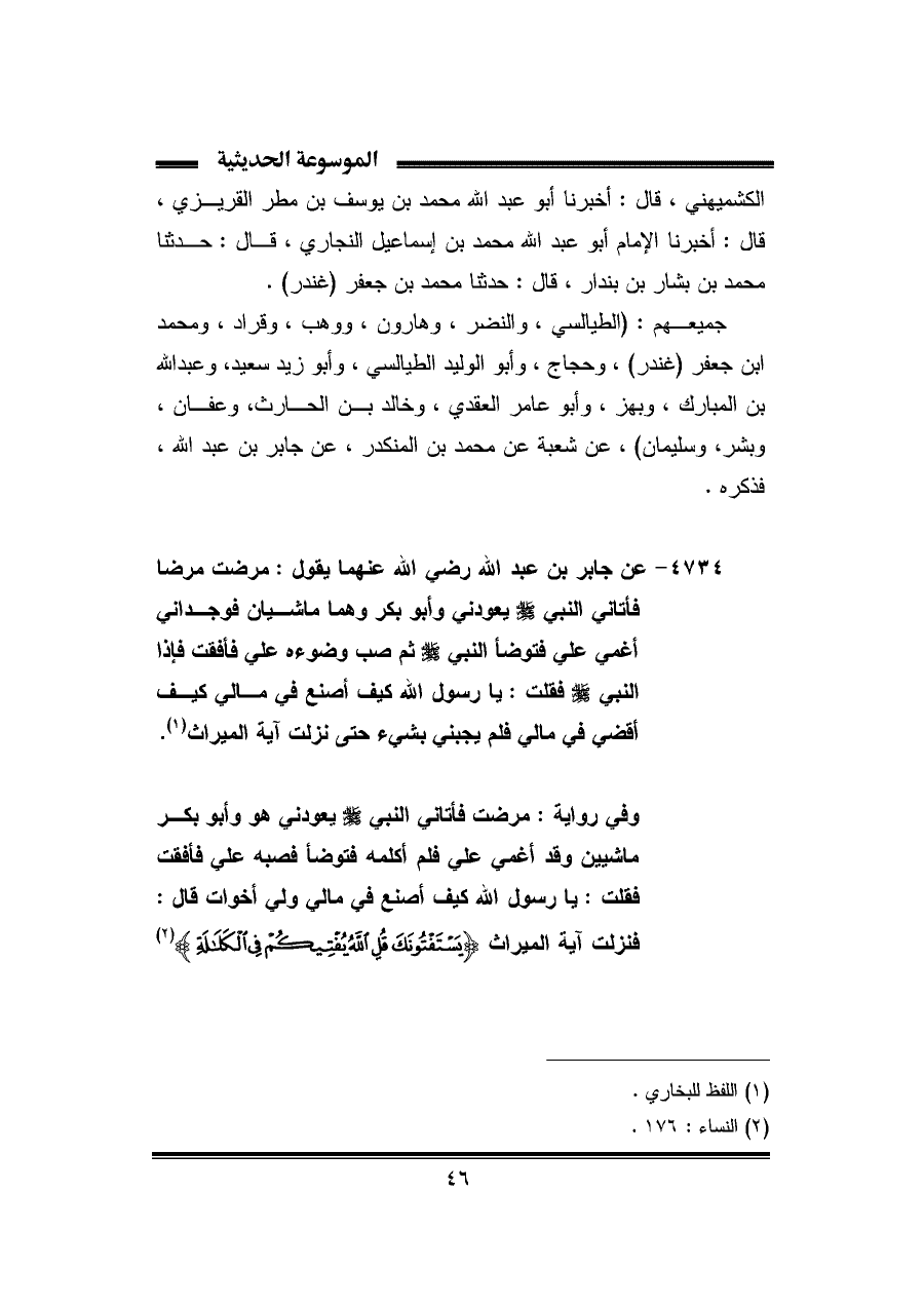 ٤٧٣٤ - عن جابر بن عبد الله رضي الله عنهما يقول: مرضت مرضا فأتاني النبي - صلى الله عليه وسلم - يعودني وأبو بكر وهما ماشيان فوجداني أغمي علي فتوضأ النبي - صلى الله عليه وسلم - ثم صب وضوءه علي فأفقت فإذا النبي - صلى الله عليه وسلم - فقلت: يا رسول الله كيف أصنع في مالي كيف أقضي في مالي فلم يجبني بشيء حتى نزلت آية الميراث (¬١).