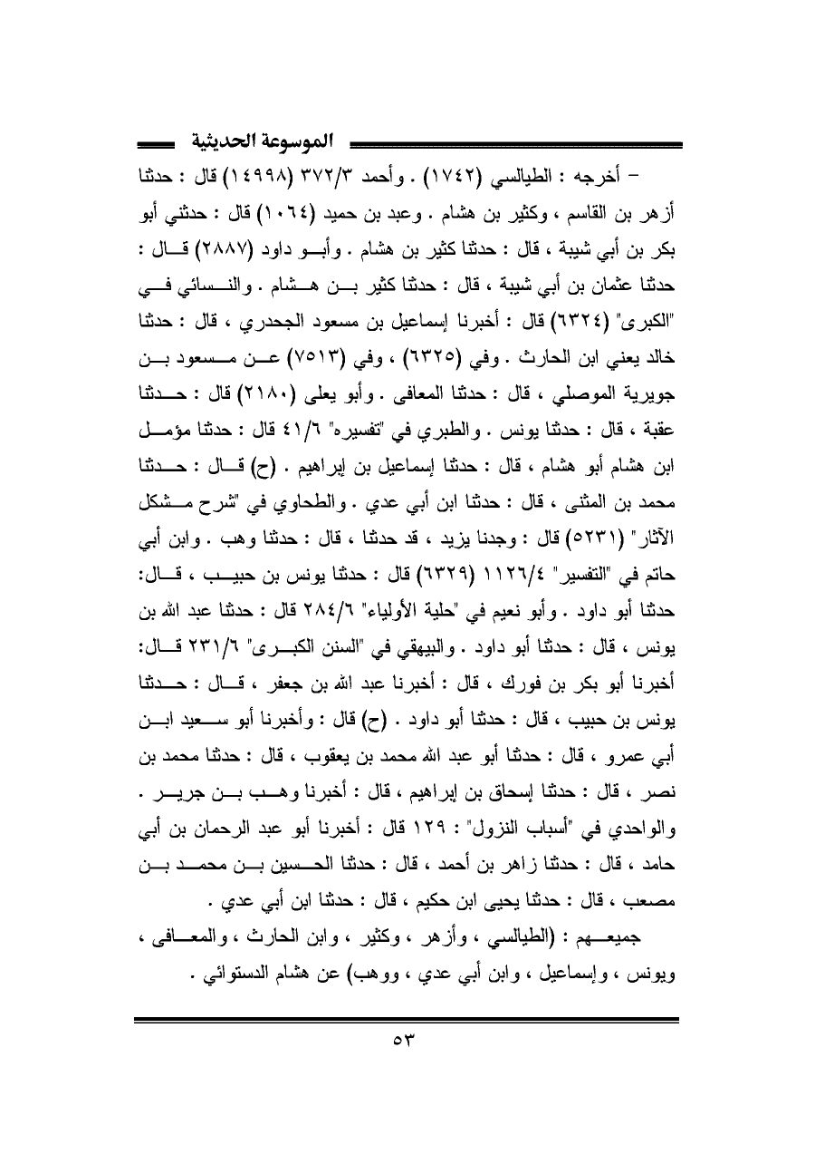 - أخرجه: الطيالسي (١٧٤٢). وأحمد ٣/ ٣٧٢ (١٤٩٩٨) قال: حدثنا أزهر بن القاسم، وكثير بن هشام. وعبد بن حميد (١٠٦٤) قال: حدثني أبو بكر بن أبي شيبة، قال: حدثنا كثير بن هشام. وأبو داود (٢٨٨٧) قال: حدثنا عثمان بن أبي شيبة، قال: حدثنا كثير بن هشام. والنسائي في "الكبرى" (٦٣٢٤) قال: أخبرنا إسماعيل بن مسعود الجحدري، قال: حدثنا خالد يعني ابن الحارث. وفي (٦٣٢٥)، وفي (٧٥١٣) عن مسعود بن جويرية الموصلي، قال: حدثنا المعافى. وأبو يعلى (٢١٨٠) قال: حدثنا عقبة، قال: حدثنا يونس. والطبري في "تفسيره" ٦/ ٤١ قال: حدثنا مؤمل بن هشام أبو هشام، قال: حدثنا إسماعيل بن إبراهيم. (ح) قال: حدثنا محمد بن المثنى، قال: حدثنا ابن أبي عدي. والطحاوي في "شرح مشكل الآثار" (٥٢٣١) قال: وجدنا يزيد، قد حدثنا، قال: حدثنا وهب. و ابن أبي حاتم في "التفسير" ٤/ ١١٢٦ (٦٣٢٩) قال: حدثنا يونس بن حبيب، قال: حدثنا أبو داود. وأبو نعيم في "حلية الأولياء" ٦/ ٢٨٤ قال: حدثنا عبد الله بن يونس، قال: حدثنا أبو داود. والبيهقي في "السنن الكبرى" ٦/ ٢٣١ قال: أخبرنا أبو بكر بن فورك، قال: أخبرنا عبد الله بن جعفر، قال: حدثنا يونس بن حبيب، قال: حدثنا أبو داود. (ح) قال: وأخبرنا أبو سعيد ابن أبي عمرو، قال: حدثنا أبو عبد الله محمد بن يعقوب، قال: حدثنا محمد بن نصر، قال: حدثنا إسحاق بن إبراهيم، قال: أخبرنا وهب بن جرير. والواحدي في "أسباب النزول": ١٢٩ قال: أخبرنا أبو عبد الرحمان بن أبي حامد، قال: حدثنا زاهر بن أحمد، قال: حدثنا الحسين بن محمد بن مصعب، قال: حدثنا يحيى بن حكيم، قال: حدثنا ابن أبي عدي. جميعهم: (الطيالسي، وأزهر، وكثير، وابن الحارث، والمعافى، ويونس، وإسماعيل، وابن أبي عدي، ووهب) عن هشام الدستوائي.