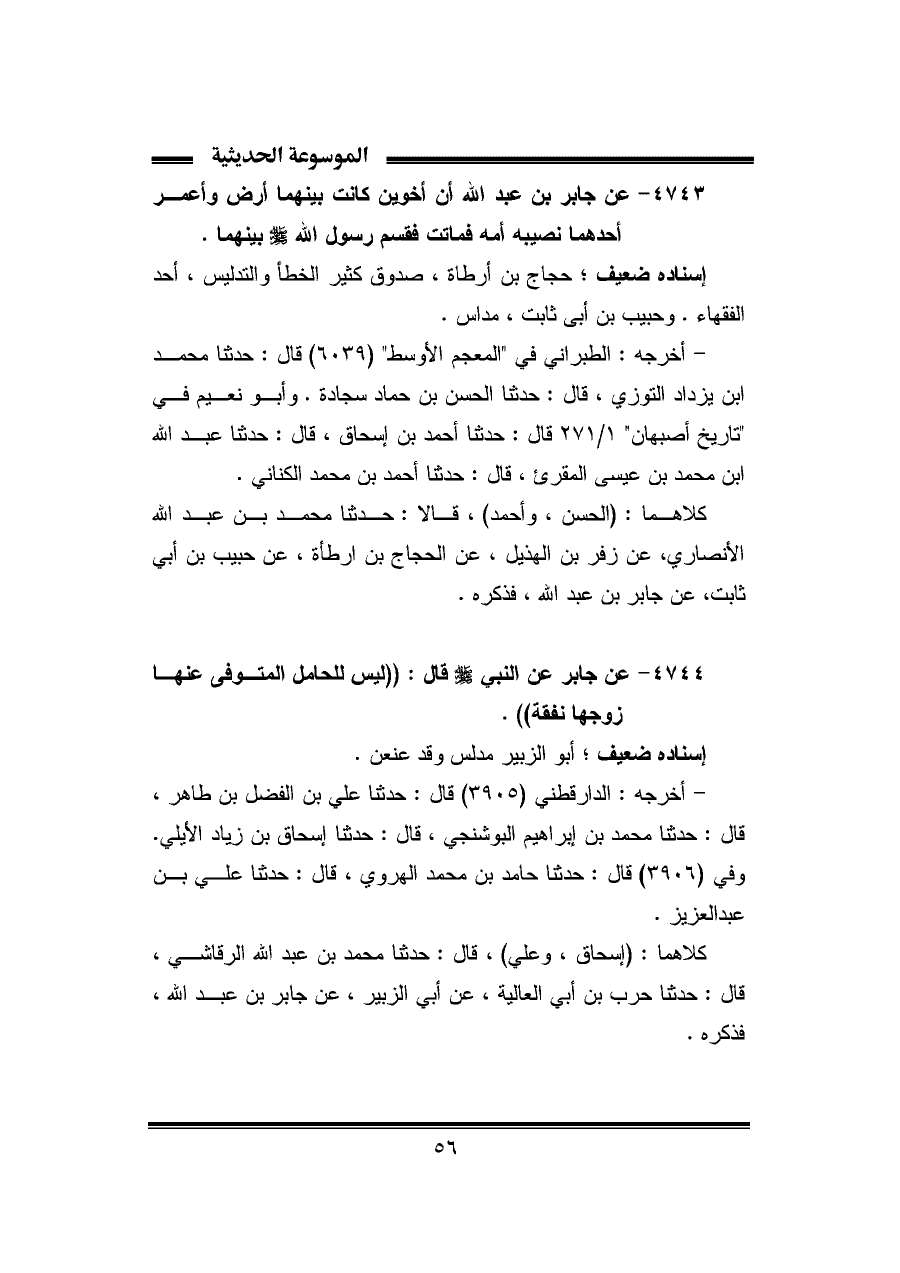 ٤٧٤٤ - عن جابر عن النبي - صلى الله عليه وسلم - قال: "ليس للحامل المتوفى عنها زوجها نفقة".