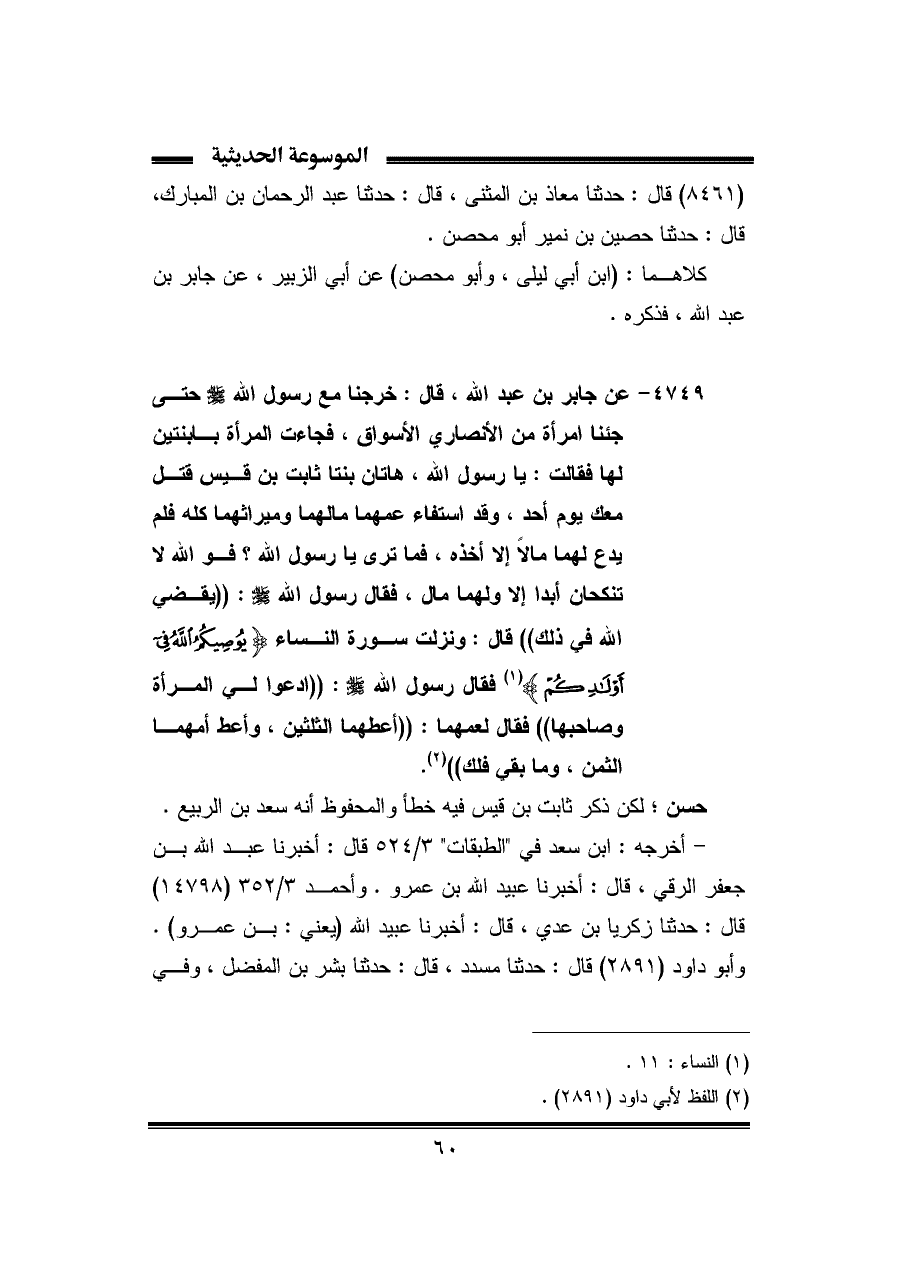 ٤٧٤٩ - عن جابر بن عبد الله، قال: خرجنا مع رسول الله - صلى الله عليه وسلم - حتى جئنا امرأة من الأنصاري الأسواق، فجاءت المرأة بابنتين لها فقالت: يا رسول الله، هاتان بنتا ثابت بن قيس قتل معك يوم أحد، وقد استفاء عمهما مالهما وميراثهما كله فلم يدع لهما مالًا إلا أخذه، فما ترى يا رسول الله؟ فوالله لا تنكحان أبدا إلا ولهما مال، فقال رسول الله - صلى الله عليه وسلم -: "يقضي الله في ذلك" قال: ونزلت سورة النساء {يُوصِيكُمُ اللَّهُ فِي أَوْلَادِكُمْ} (¬١) فقال رسول الله - صلى الله عليه وسلم -: "ادعوا لي المرأة وصاحبها" فقال لعمهما: "أعطهما الثلثين، وأعط أمهما الثمن، وما بقي فلك" (¬٢).