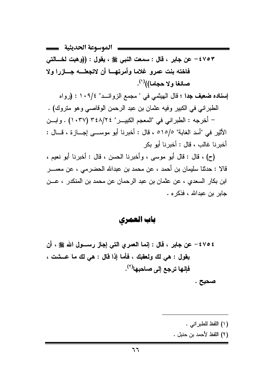 ٤٧٥٣ - عن جابر، قال: سمعت النبي - صلى الله عليه وسلم -، يقول: "وهبت لخالتي فاخته بنت عمرو غلاما وأمرتها أن لا تجعله جازرا ولا صائغا ولا حجاما" (¬١).