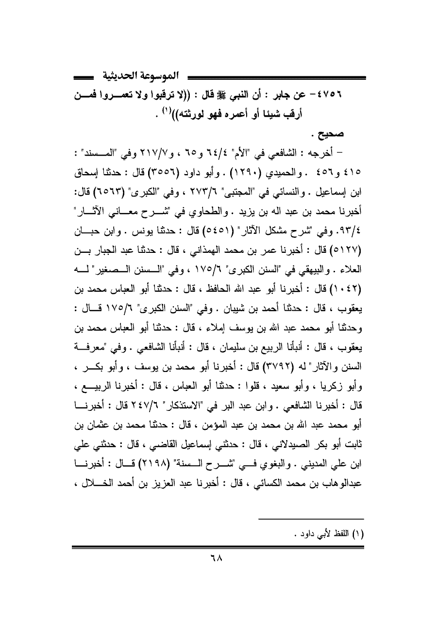 ٤٧٥٦ - عن جابر: أن النبي - صلى الله عليه وسلم - قال: "لا ترقبوا ولا تعمروا فمن أرقب شيئا أو أعمره فهو لورثته" (¬١).