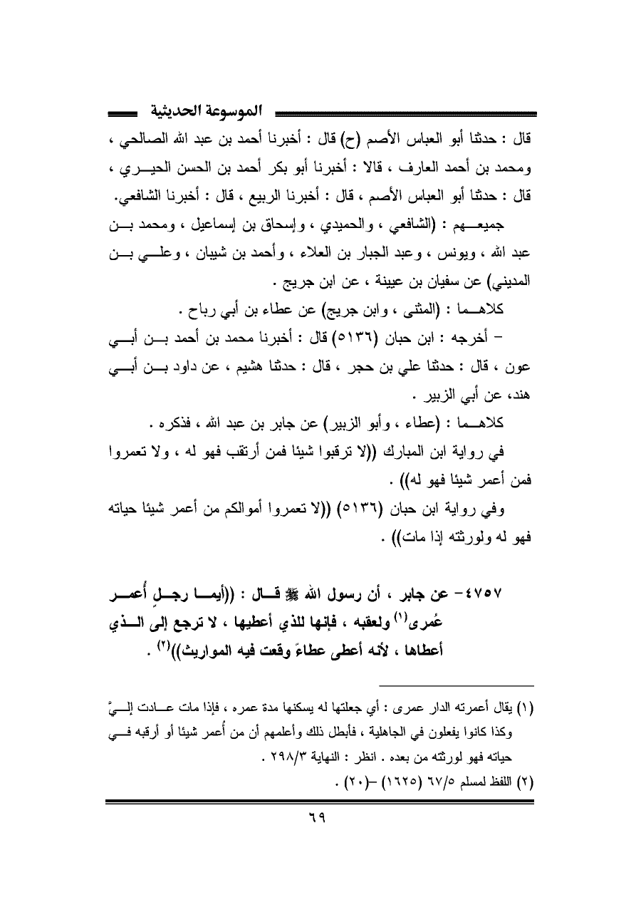 ٤٧٥٧ - عن جابر، أن رسول الله - صلى الله عليه وسلم - قال: "أيما رجلٍ أُعمر عُمرى (¬١) ولعقبه، فإنها للذي أعطيها، لا ترجع إلى الذي أعطاها، لأنه أعطى عطاءً وقعت فيه المواريث" (¬٢).