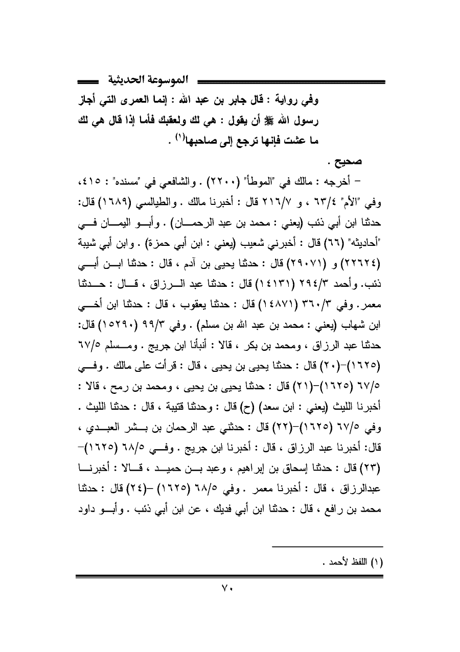 وفي رواية: قال جابر بن عبد الله: إنما العمرى التي أجاز رسول الله - صلى الله عليه وسلم - أن يقول: هي لك ولعقبك فأما إذا قال هي لك ما عشت فإنها ترجع إلى صاحبها (¬١).