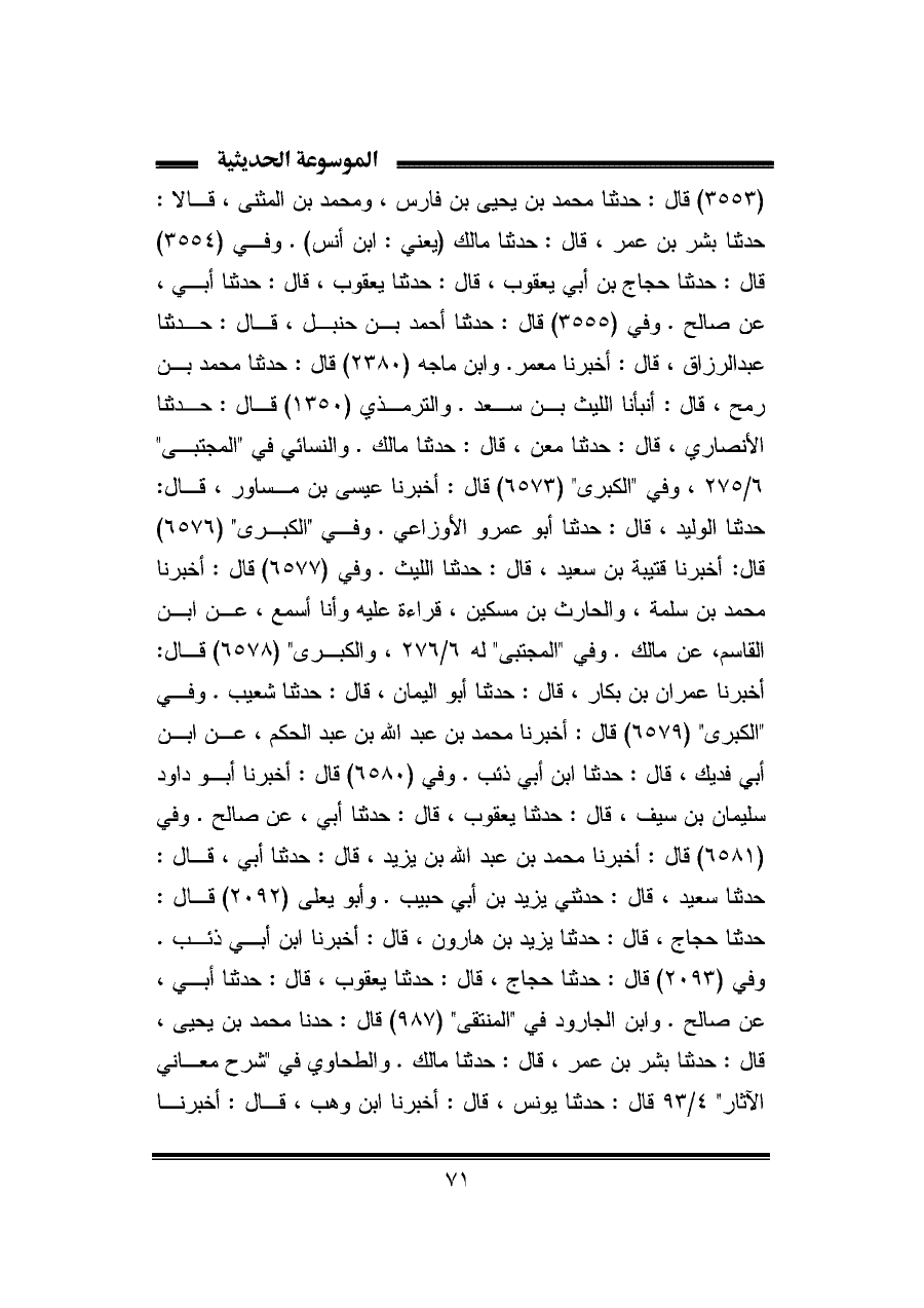 (٣٥٥٣) قال: حدثنا محمد بن يحيى بن فارس، ومحمد بن المثنى، قالا: حدثنا بشر بن عمر، قال: حدثنا مالك (يعني: ابن أنس). وفي (٣٥٥٤) قال: حدثنا حجاج بن أبي يعقوب، قال: حدثنا يعقوب، قال: حدثنا أبي، عن صالح. وفي (٣٥٥٥) قال: حدثنا أحمد بن حنبل، قال: حدثنا عبد الرزاق، قال: أخبرنا معمر. وابن ماجه (٢٣٨٠) قال: حدثنا محمد بن رمح، قال: أنبأنا الليث بن سعد. والترمذي (١٣٥٠) قال: حدثنا الأنصاري، قال: حدثنا معن، قال: حدثنا مالك. و النسائي في "المجتبى" ٦/ ٢٧٥، وفي "الكبرى" (٦٥٧٣) قال: أخبرنا عيسى بن مساور، قال: حدثنا الوليد، قال: حدثنا أبو عمرو الأوزاعي. وفي "الكبرى" (٦٥٧٦) قال: أخبرنا قتيبة بن سعيد، قال: حدثنا الليث. وفي (٦٥٧٧) قال: أخبرنا محمد بن سلمة، والحارث بن مسكين، قراءة عليه وأنا أسمع، عن ابن القاسم، عن مالك. وفي "المجتبى" له ٦/ ٢٧٦، و الكبرى" (٦٥٧٨) قال: أخبرنا عمران بن بكار، قال: حدثنا أبو اليمان، قال: حدثنا شعيب. وفي "الكبرى" (٦٥٧٩) قال: أخبرنا محمد بن عبد الله بن عبد الحكم، عن ابن أبي فديك، قال: حدثنا ابن أبي ذئب. وفي (٦٥٨٠) قال: أخبرنا أبو داود سليمان بن سيف، قال: حدثنا يعقوب، قال: حدثنا أبي، عن صالح. وفي (٦٥٨١) قال: أخبرنا محمد بن عبد الله بن يزيد، قال: حدثنا أبي، قال: حدثنا سعيد، قال: حدثني يزيد بن أبي حبيب. وأبو يعلى (٢٠٩٢) قال: حدثنا حجاج، قال: حدثنا يزيد بن هارون، قال: أخبرنا ابن أبي ذئب. وفي (٢٠٩٣) قال: حدثنا حجاج، قال: حدثنا يعقوب، قال: حدثنا أبي، عن صالح. وابن الجارود في "المنتقى" (٩٨٧) قال: حدثنا محمد بن يحيى، قال: حدثنا بشر بن عمر، قال: حدثنا مالك. والطحاوي في "شرح معاني الآثار" ٤/ ٩٣ قال: حدثنا يونس، قال: أخبرنا ابن وهب، قال: أخبرنا