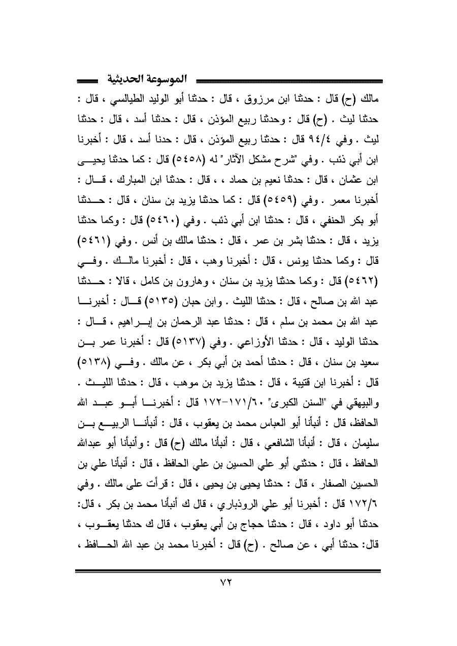 مالك (ح) قال: حدثنا ابن مرزوق، قال: حدثنا أبو الوليد الطيالسي، قال: حدثنا ليث. (ح) قال: وحدثنا ربيع المؤذن، قال: حدثنا أسد، قال: حدثنا ليث. وفي ٤/ ٩٤ قال: حدثنا ربيع المؤذن، قال: حدنا أسد، قال: أخبرنا ابن أبي ذئب. وفي "شرح مشكل الآثار" له (٥٤٥٨) قال: كما حدثنا يحيى بن عثمان، قال: حدثنا نعيم بن حماد، قال: حدثنا ابن المبارك، قال: أخبرنا معمر. وفي (٥٤٥٩) قال: كما حدثنا يزيد بن سنان، قال: حدثنا أبو بكر الحنفي، قال: حدثنا ابن أبي ذئب. وفي (٥٤٦٠) قال: وكما حدثنا يزيد، قال: حدثنا بشر بن عمر، قال: حدثنا مالك بن أنس. وفي (٥٤٦١) قال: وكما حدثنا يونس، قال: أخبرنا وهب، قال: أخبرنا مالك. وفي (٥٤٦٢) قال: وكما حدثنا يزيد بن سنان، وهارون بن كامل، قالا: حدثنا عبد الله بن صالح، قال: حدثنا الليث. وابن حبان (٥١٣٥) قال: أخبرنا عبد الله بن محمد بن سلم، قال: حدثنا عبد الرحمان بن إبراهيم، قال: حدثنا الوليد، قال: حدثنا الأوزاعي. وفي (٥١٣٧) قال: أخبرنا عمر بن سعيد بن سنان، قال: حدثنا أحمد بن أبي بكر، عن مالك. وفي (٥١٣٨) قال: أخبرنا ابن قتيبة، قال: حدثنا يزيد بن موهب، قال: حدثنا الليث. والبيهقي في "السنن الكبرى" ٦٠/ ١٧١ - ١٧٢ قال: أخبرنا أبو عبد الله الحافظ، قال: أنبأنا أبو العباس محمد بن يعقوب، قال: أنبأنا الربيع بن سليمان، قال: أنبأنا الشافعي، قال: أنبأنا مالك (ح) قال: وأنبأنا أبو عبد الله الحافظ، قال: حدثني أبو علي الحسين بن علي الحافظ، قال: أنبأنا علي بن الحسين الصفار، قال: حدثنا يحيى بن يحيى، قال: قرأت على مالك. وفي ٦/ ١٧٢ قال: أخبرنا أبو علي الروذباري، قال: أنبأنا محمد بن بكر، قال: حدثنا أبو داود، قال: حدثنا حجاج بن أبي يعقوب، قال: حدثنا يعقوب، قال: حدثنا أبي، عن صالح. (ح) قال: أخبرنا محمد بن عبد الله الحافظ،