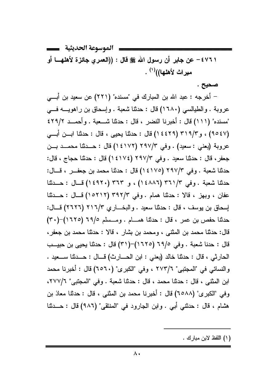 ٤٧٦١ - عن جابر أن رسول الله -صلى الله عليه وسلم- قال: "العمري جائزة لأهلها أو ميراث لأهلها" (¬١).