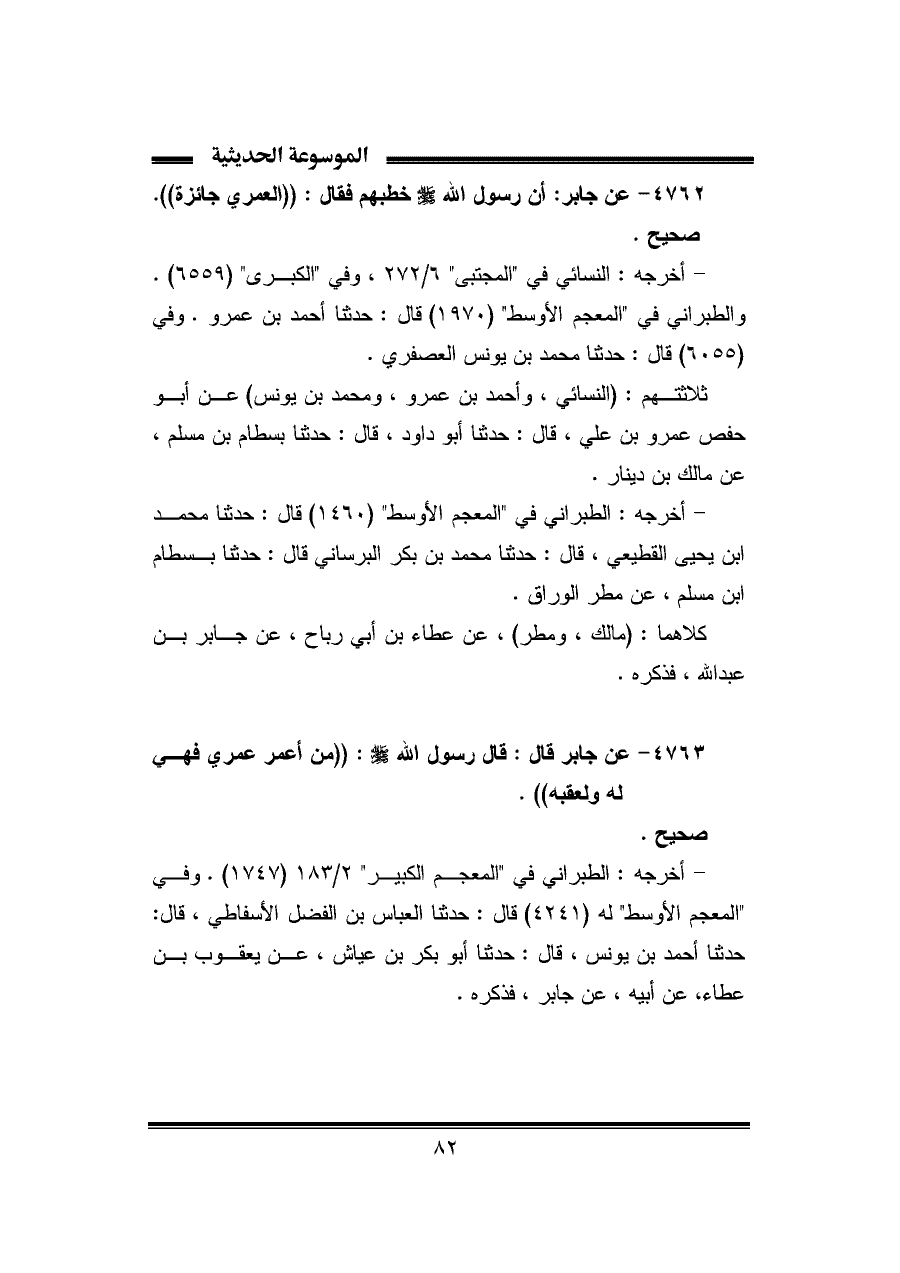 ٤٧٦٢ - عن جابر: أن رسول الله -صلى الله عليه وسلم- خطبهم فقال: "العمري جائزة".