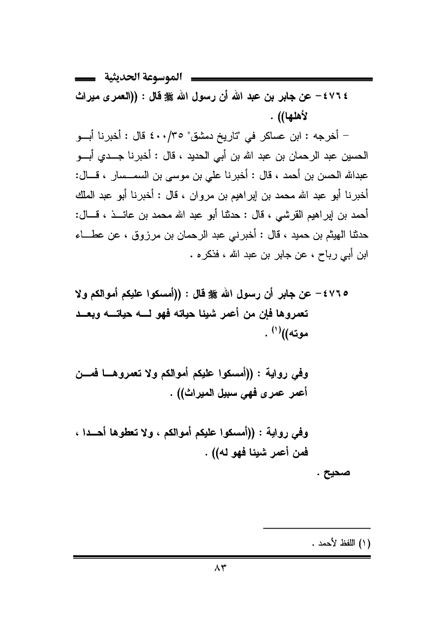 ٤٧٦٤ - عن جابر بن عبد الله أن رسول الله -صلى الله عليه وسلم- قال: "العمرى ميراث لأهلها".