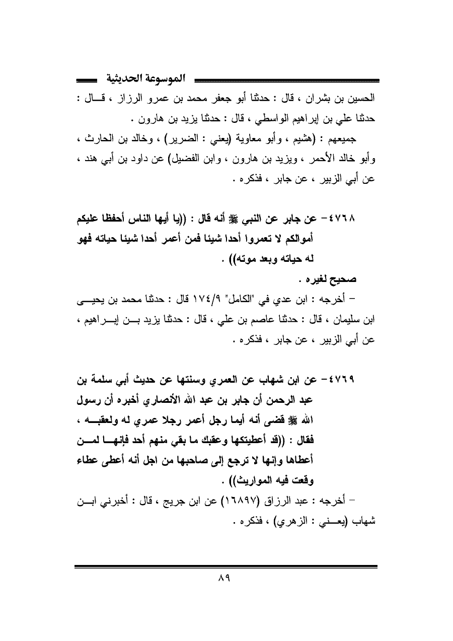 ٤٧٦٨ - عن جابر عن النبي -صلى الله عليه وسلم- أنه قال: "يا أيها الناس أحفظا عليكم أموالكم لا تعمروا أحدا شيئا فمن أعمر أحدا شيئا حياته فهو له حياته وبعد موته".