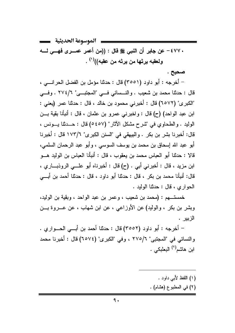 ٤٧٧٠ - عن جابر أن النبي -صلى الله عليه وسلم- قال: "من أعمر عمرى فهي له ولعقبه يرثها من يرثه من عقبه" (¬١).