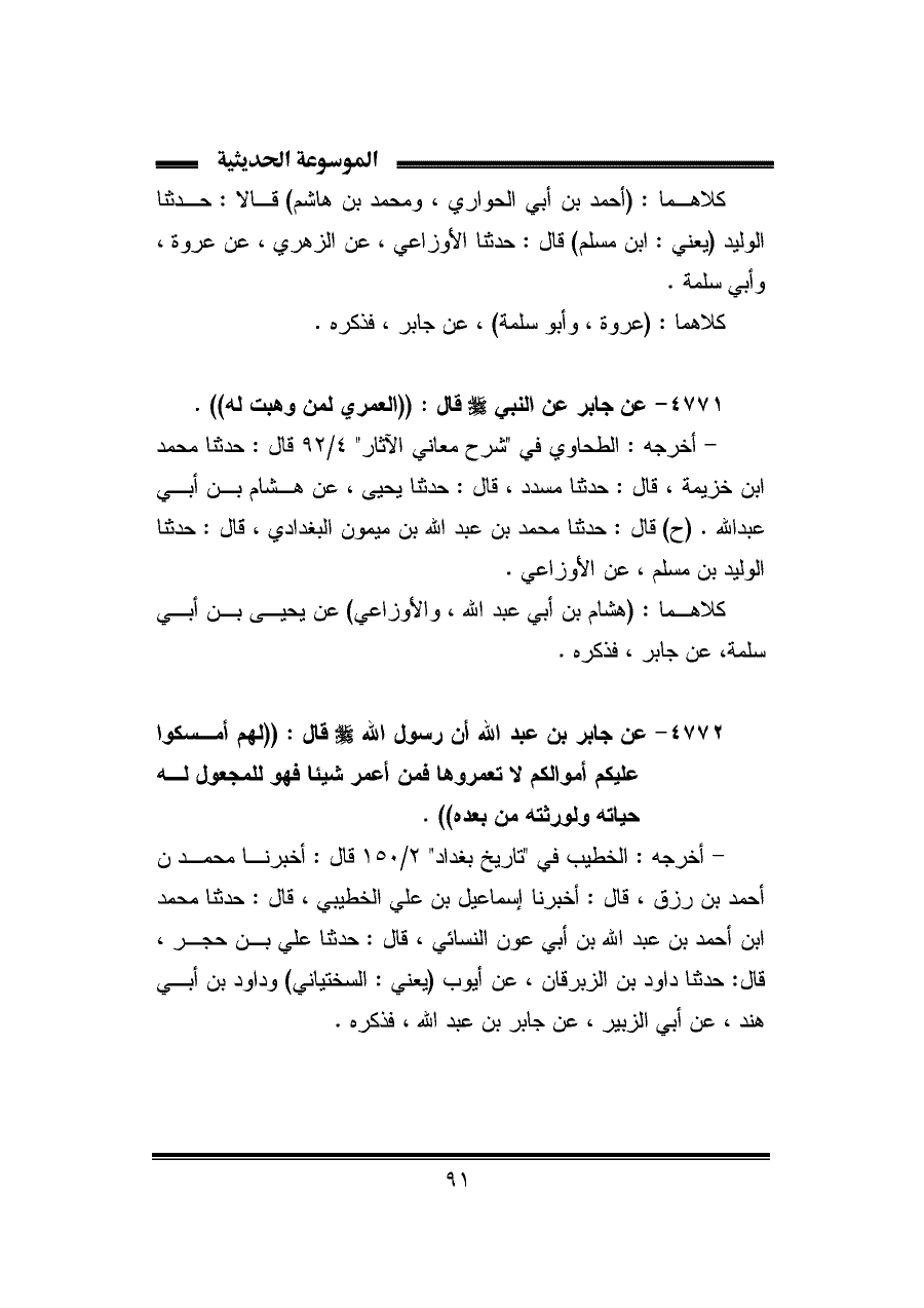 ٤٧٧٢ - عن جابر بن عبد الله أن رسول الله -صلى الله عليه وسلم- قال: "لهم أمسكوا عليكم أموالكم لا تعمروها فمن أعمر شيئا فهو للمجعول له حياته ولورثته من بعده".