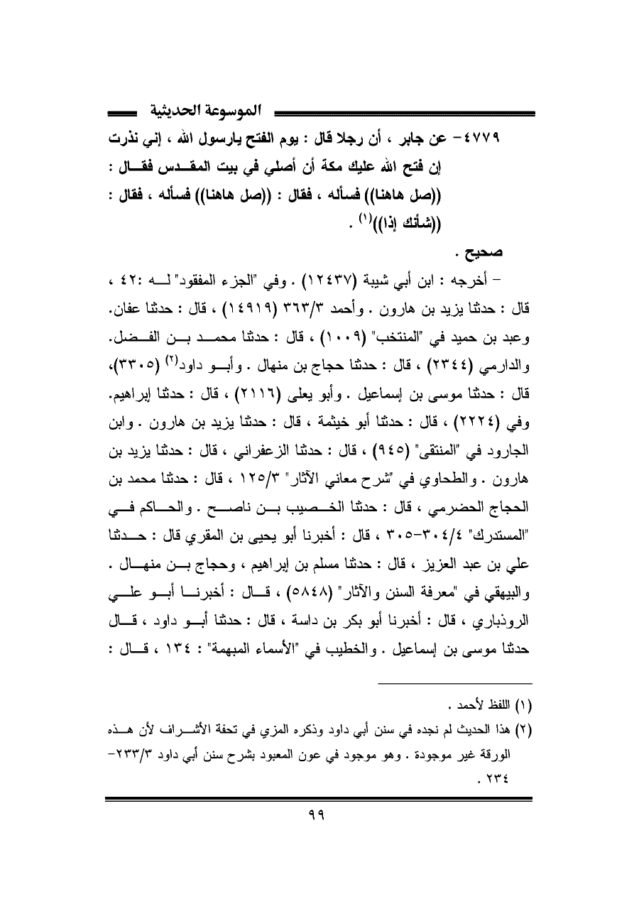 ٤٧٧٩ - عن جابر، أن رجلا قال: يوم الفتح يا رسول الله، إني نذرت إن فتح الله عليك مكة أن أصلي في بيت المقدس فقال: "صل ها هنا" فسأله، فقال: "صل ها هنا" فسأله، فقال: "شأنك إذا" (¬١).