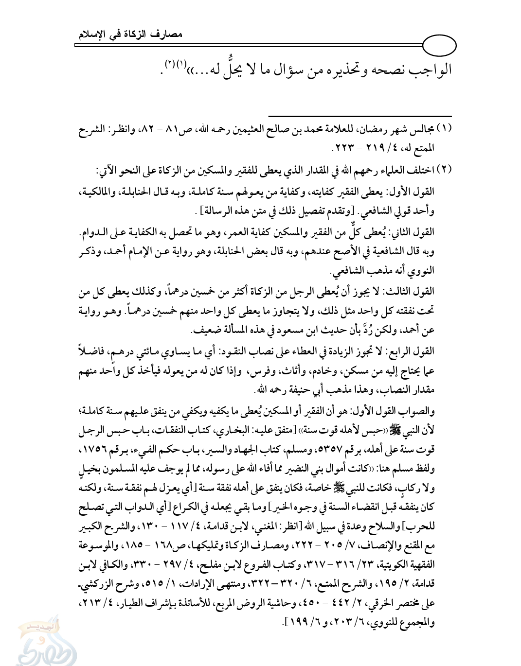 (¬2) اختلف العلماء رحمهم الله في المقدار الذي يعطى للفقير والمسكين من الزكاة على النحو الآتي:
