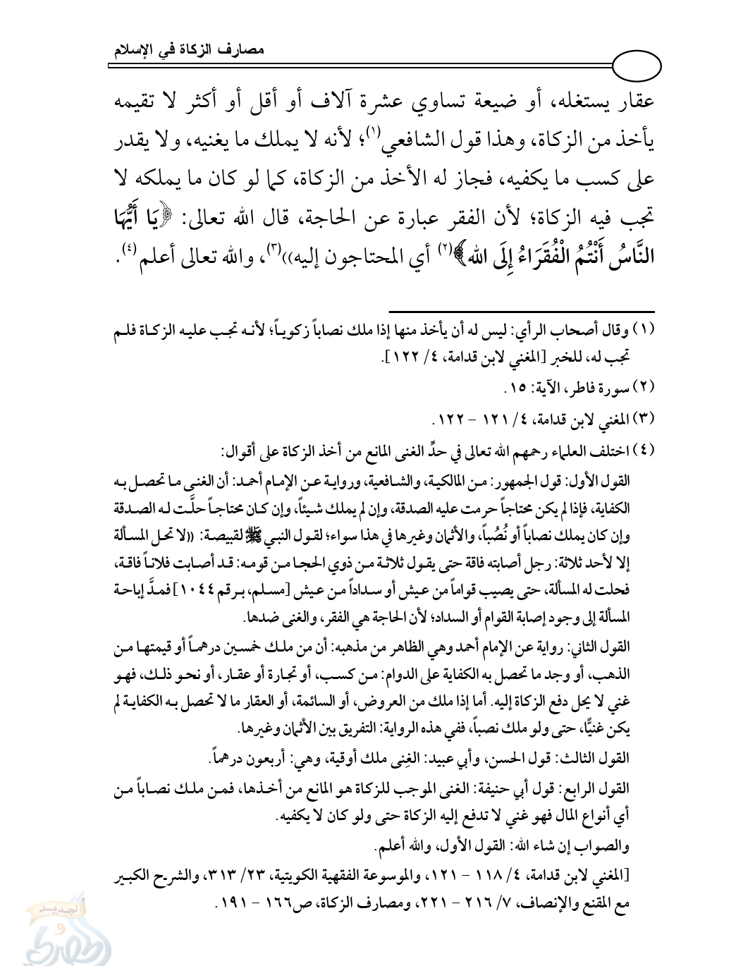 [المغني لابن قدامة، 4/ 118 - 121، والموسوعة الفقهية الكويتية، 23/ 313، والشرح الكبير مع المقنع والإنصاف، 7/ 216 - 221، ومصارف الزكاة، ص166 - 191.