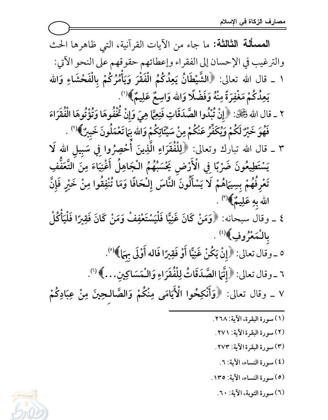المسألة الثالثة: ما جاء من الآيات القرآنية, التي ظاهرها الحث والترغيب في الإحسان إلى الفقراء وإعطائهم حقوقهم على النحو الآتي: