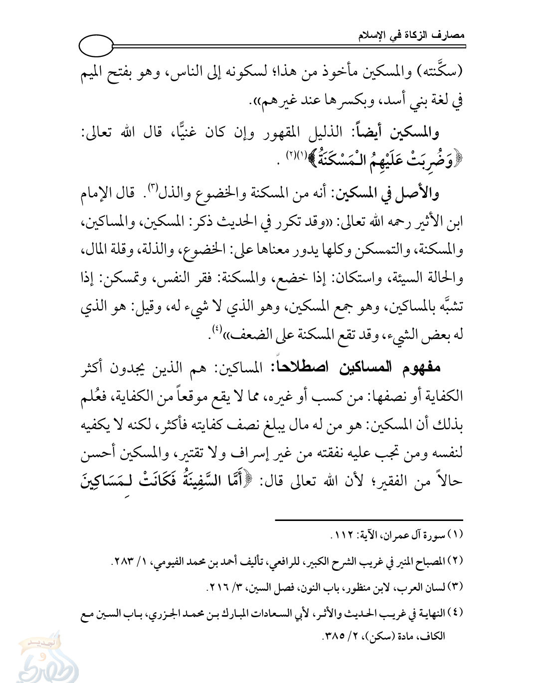مفهوم المساكين اصطلاحاً: المساكين: هم الذين يجدون أكثر الكفاية أو نصفها: من كسب أو غيره، مما لا يقع موقعاً من الكفاية، فعُلم بذلك أن المسكين: هو من له مال يبلغ نصف كفايته فأكثر، لكنه لا يكفيه لنفسه ومن تجب عليه نفقته من غير إسراف ولا تقتير، والمسكين أحسن حالاً من الفقير؛ لأن الله تعالى قال: {أَمَّا السَّفِينَةُ فَكَانَتْ لِمَسَاكِينَ