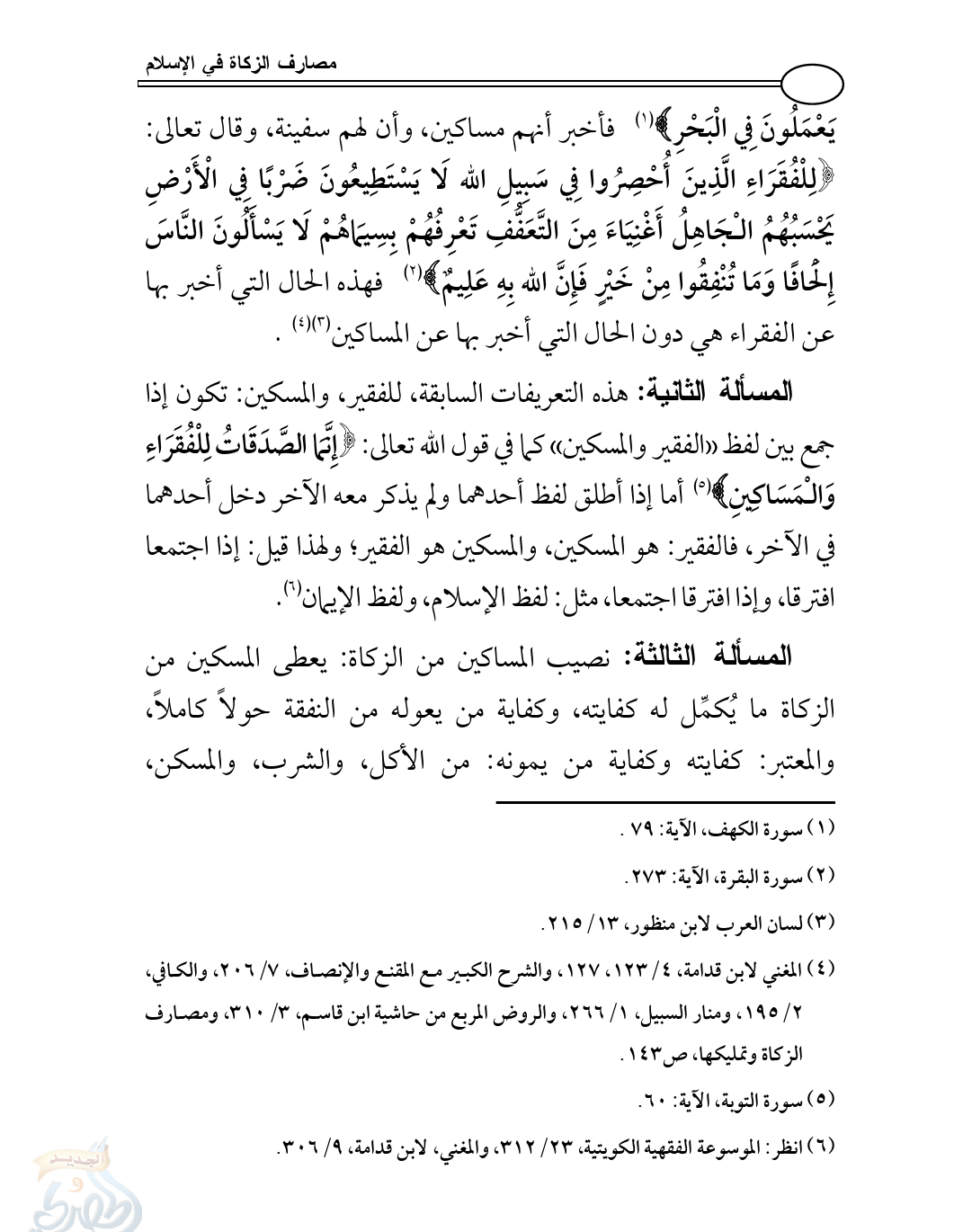 (¬4) المغني لابن قدامة، 4/ 123، 127، والشرح الكبير مع المقنع والإنصاف، 7/ 206، والكافي، 2/ 195، ومنار السبيل، 1/ 266، والروض المربع من حاشية ابن قاسم، 3/ 310، ومصارف الزكاة وتمليكها، ص143.