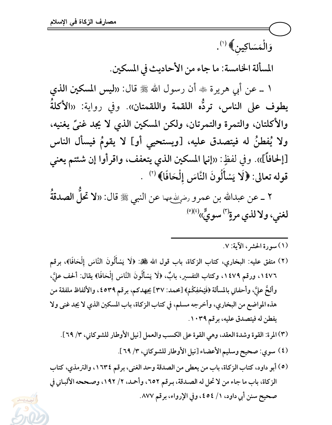 (¬5) أبو داود، كتاب الزكاة، باب من يعطى من الصدقة وحد الغنى، برقم 1634، والترمذي، كتاب الزكاة، باب ما جاء من لا تحل له الصدقة، برقم 652، وأحمد، 2/ 192، وصححه الألباني في صحيح سنن أبي داود، 1/ 454، وفي الإرواء، برقم 877.