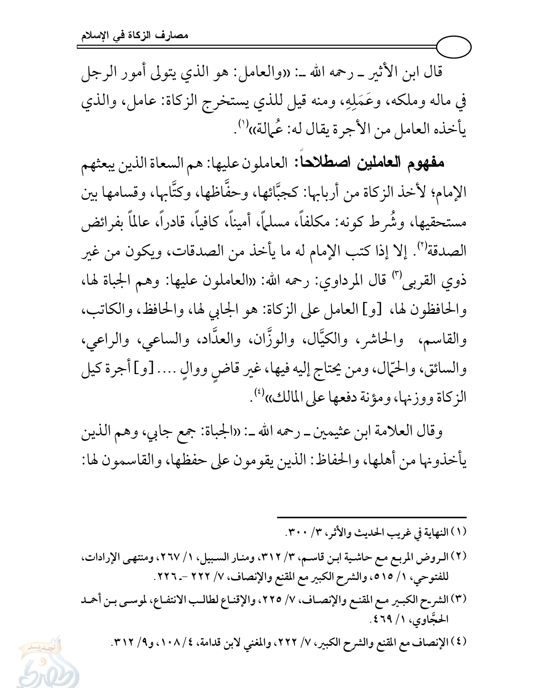 مفهوم العاملين اصطلاحاً: العاملون عليها: هم السعاة الذين يبعثهم الإمام؛ لأخذ الزكاة من أربابها: كجبَّائها، وحفَّاظها، وكتَّابها، وقسامها بين مستحقيها، وشُرط كونه: مكلفاً، مسلماً، أميناً، كافياً، قادراً، عالماً بفرائض الصدقة (¬2). إلا إذا كتب الإمام له ما يأخذ من الصدقات، ويكون من غير ذوي القربى (¬3) قال المرداوي: رحمه الله: ((العاملون عليها: وهم الجباة لها، والحافظون لها، [و] العامل على الزكاة: هو الجابي لها، والحافظ، والكاتب، والقاسم، والحاشر، والكيَّال، والوزَّان، والعدَّاد، والساعي، والراعي، والسائق، والحمّال، ومن يحتاج إليه فيها، غير قاضٍ ووالٍ .... [و] أجرة كيل الزكاة ووزنها، ومؤنة دفعها على المالك)) (¬4).