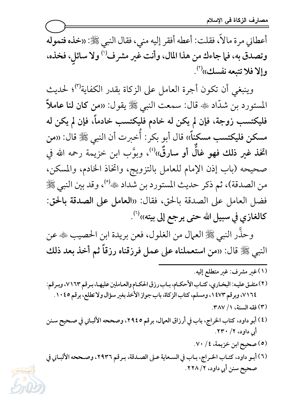 (¬6) أبو داود، كتاب الخراج، باب في السعاية على الصدقة، برقم 2936، وصححه الألباني في صحيح سنن أبي داود، 2/ 228.