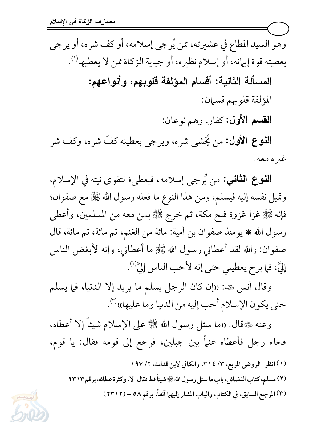 النوع الثاني: من يُرجى إسلامه، فيعطى؛ لتقوى نيته في الإسلام، وتميل نفسه إليه فيسلم، ومن هذا النوع ما فعله رسول الله - صلى الله عليه وسلم - مع صفوان؛ فإنه - صلى الله عليه وسلم - غزا غزوة فتح مكة، ثم خرج - صلى الله عليه وسلم - بمن معه من المسلمين، وأعطى رسول الله * يومئذ صفوان بن أمية: مائة من الغنم، ثم مائة، ثم مائة، قال صفوان: والله لقد أعطاني رسول الله - صلى الله عليه وسلم - ما أعطاني، وإنه لأبغض الناس إليَّ، فما برح يعطيني حتى إنه لأحب الناس إليَّ (¬2).