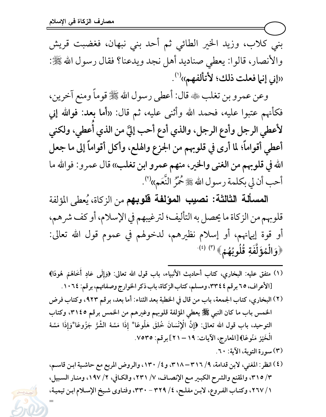 المسألة الثالثة: نصيب المؤلفة قلوبهم من الزكاة، يُعطى المؤلفة قلوبهم من الزكاة ما يحصل به التأليف؛ لترغيبهم في الإسلام، أو كف شرهم، أو قوة إيمانهم، أو إسلام نظيرهم، لدخولهم في عموم قول الله تعالى: {وَالْمُؤَلَّفَةِ قُلُوبُهُمْ} (¬3) (¬4).