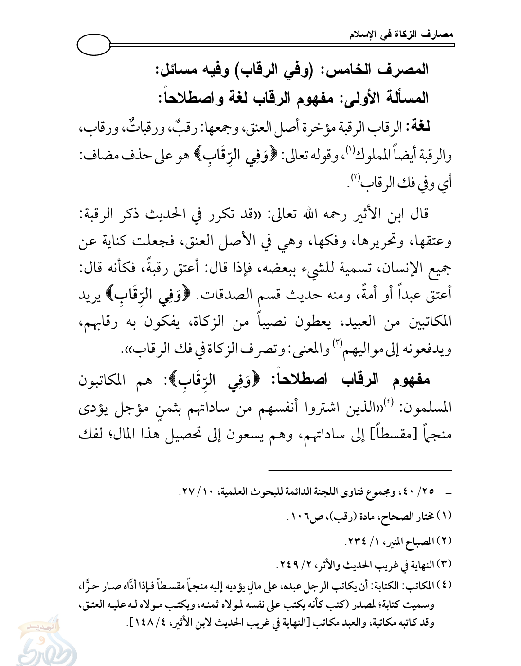 مفهوم الرقاب اصطلاحاً: {وَفِي الرِّقَابِ}: هم المكاتبون المسلمون: (¬4) ((الذين اشتروا أنفسهم من ساداتهم بثمنٍ مؤجل يؤدى منجماً [مقسطاً] إلى ساداتهم، وهم يسعون إلى تحصيل هذا المال؛ لفك