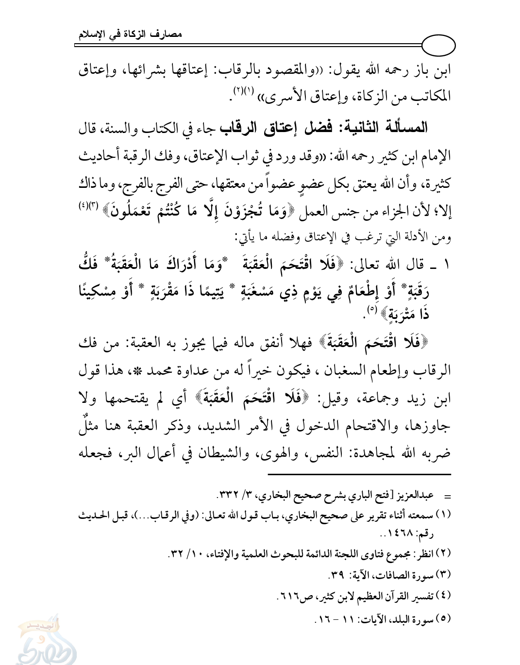ابن باز رحمه الله يقول: ((والمقصود بالرقاب: إعتاقها بشرائها، وإعتاق المكاتب من الزكاة، وإعتاق الأسرى)) (¬1) (¬2).