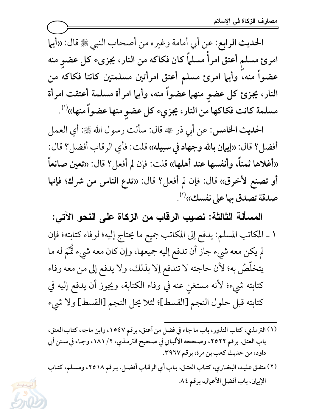 المسألة الثالثة: نصيب الرقاب من الزكاة على النحو الآتي: