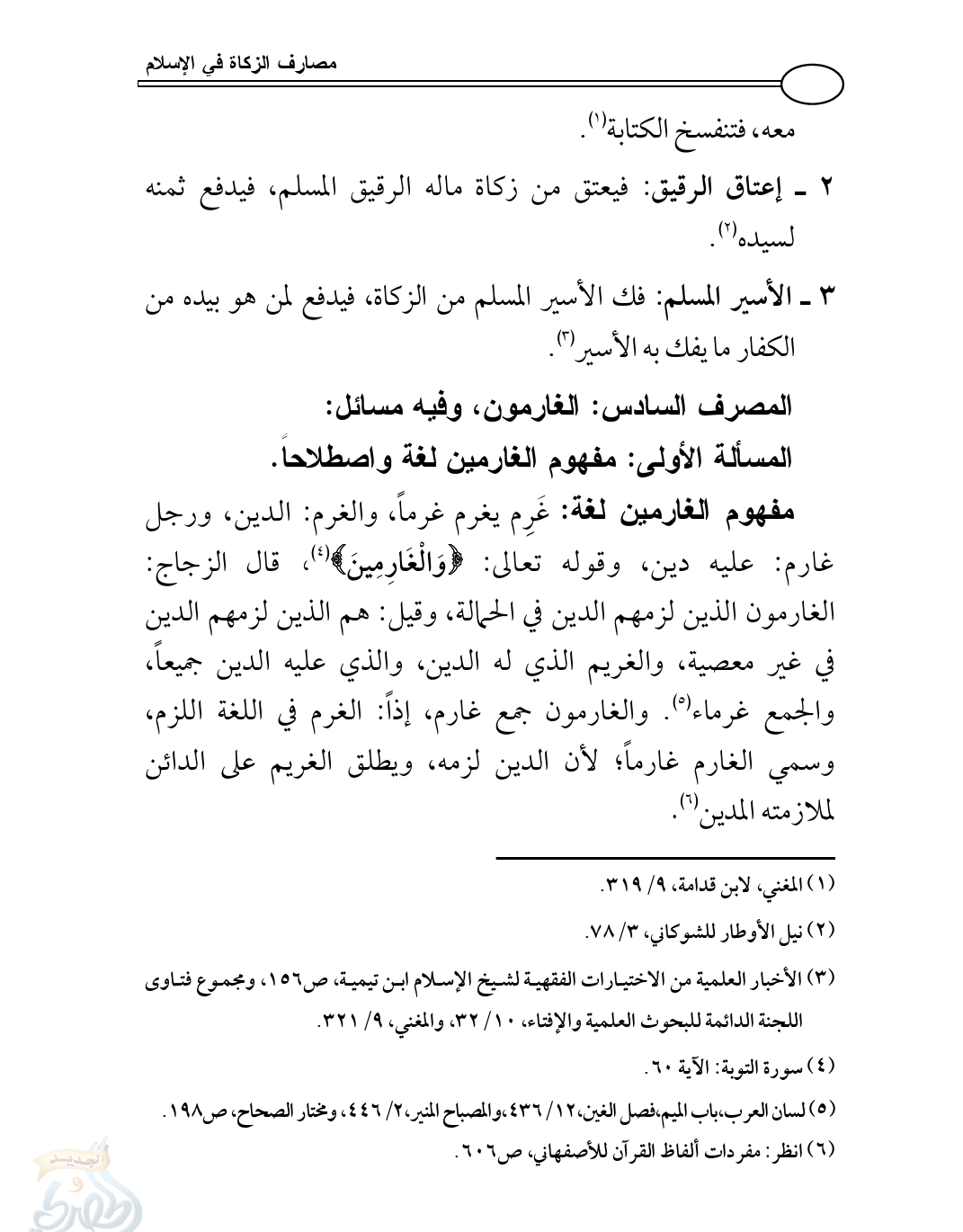 المسألة الأولى: مفهوم الغارمين لغة واصطلاحاً.