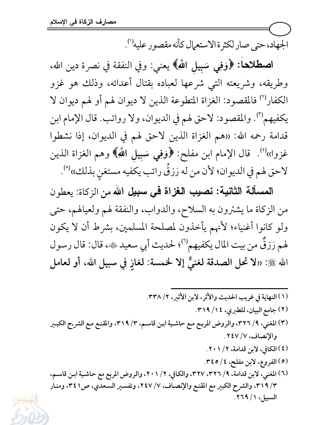 اصطلاحاً: {وَفِي سَبِيلِ اللَّهِ} يعني: وفي النفقة في نصرة دين الله، وطريقه، وشريعته التي شرعها لعباده بقتال أعدائه، وذلك هو غزو الكفار (¬2) فالمقصود: الغزاة المتطوعة الذين لا ديوان لهم أو لهم ديوان لا يكفيهم (¬3). والمقصود: لاحق لهم في الديوان، ولا رواتب. قال الإمام ابن قدامة رحمه الله: ((هم الغزاة الذين لاحق لهم في الديوان، إذا نشطوا غزوا)) (¬4). قال الإمام ابن مفلح: {وَفِي سَبِيلِ اللَّهِ} وهم الغزاة الذين لاحق لهم في الديوان؛ لأن من له رَزقُ راتب يكفيه مستغنٍ بذلك)) (¬5).