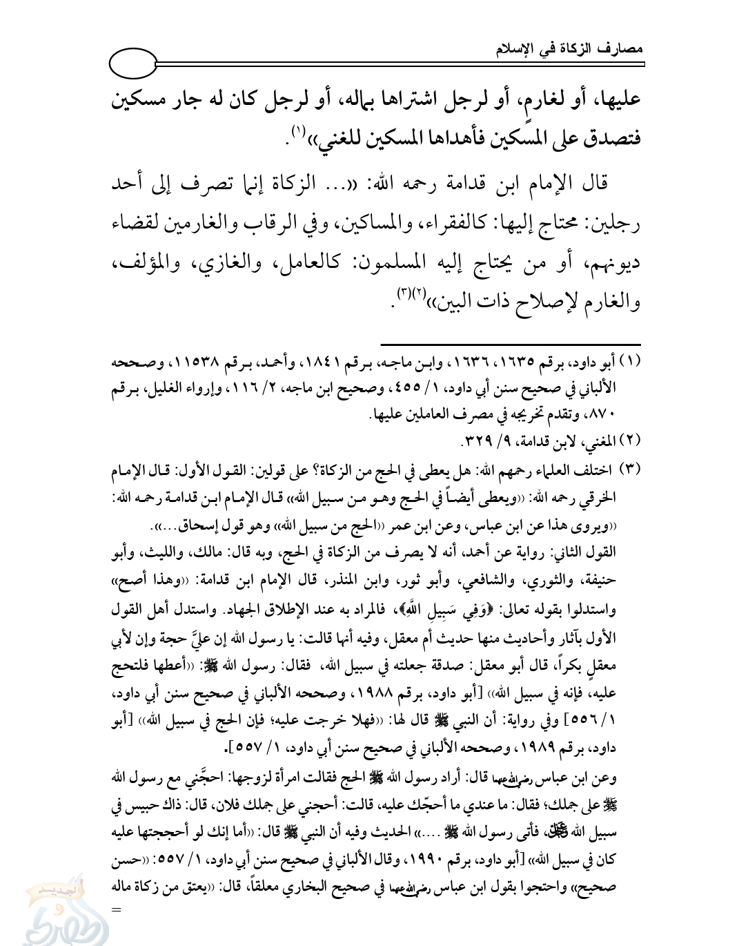 قال الإمام ابن قدامة رحمه الله: (( ... الزكاة إنما تصرف إلى أحد رجلين: محتاج إليها: كالفقراء، والمساكين، وفي الرقاب والغارمين لقضاء ديونهم، أو من يحتاج إليه المسلمون: كالعامل، والغازي، والمؤلف، والغارم لإصلاح ذات البين)) (¬2) (¬3).