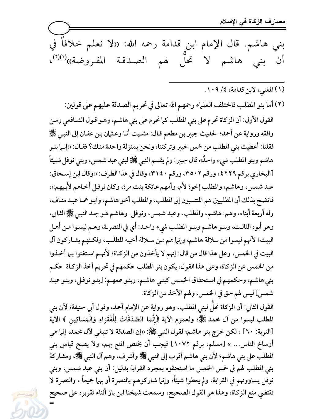 القول الثاني: أن الزكاة تحلُّ لبني المطلب، وهو رواية عن الإمام أحمد، وقول أبي حنيفة؛ لأن بني المطلب ليسوا من آل محمد - صلى الله عليه وسلم -؛ ولعموم الآية {إِنَّمَا الصَّدَقَاتُ لِلْفُقَرَاءِ وَالْمَسَاكِينِ} الآية [التوبة: 60]، لكن خرج بنو هاشم؛ لقول النبي - صلى الله عليه وسلم -: ((إن الصدقة لا تنبغي لآل محمد, إنما هي أوساخ الناس ... )) [مسلم، برقم 1072] فيجب أن يختص المنع بهم، ولا يصح قياس بني المطلب على بني هاشم؛ لأن بني هاشم أقرب إلى النبي - صلى الله عليه وسلم - وأشرف، وهم آل النبي - صلى الله عليه وسلم -، ومشاركة بني المطلب لهم في خمس الخمس ما استحقوه بمجرد القرابة بدليل: أن بني عبد شمس، وبني نوفل يساوونهم في القرابة، ولم يعطوا شيئاً؛ وإنما شاركوهم بالنصرة أو بهما جميعاً، والنصرة لا تقتضي منع الزكاة، وهذا هو القول الصحيح، وسمعت شيخنا ابن باز أثناء تقريره على صحيح البخاري، الحديث رقم 3140، يقول: ((بنو المطلب يعطون من الخمس؛ لأنهم ناصروا النبي - صلى الله عليه وسلم - في الجاهلية والإسلام، ويعطون من الزكاة على الصحيح؛ لأنه منع الزكاة عن بني هاشم فقط)) واختار هذا القول أيضاً الخرقي في مختصره مع المغني، 4/ 109، وابن قدامة في المغني، 4/ 111، وفي المقنع مع الشرح الكبير، 7/ 289، وفي العمدة، وشيخ الإسلام كما في الفروع مع تصحيحه، 4/ 370، والإنصاف مع الشرح الكبير، 7/ 307، وصاحب الروض المربع، 3/ 329، وغيرهم كثير, وقال العلامة ابن عثيمين رحمه الله في الشرح الممتع، 6/ 259: ((والصحيح ... أنه يصح دفع الزكاة إلى بني المطلب)). وانظر: المجموع للنووي، 6/ 167، وفتح الباري لابن حجر،