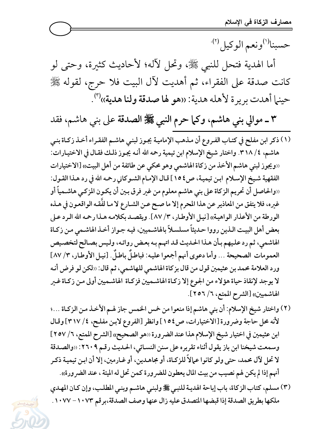 (¬1) ذكر ابن مفلح في كتاب الفروع أن مذهب الإمامية يجوز لبني هاشم الفقراء أخذ زكاة بني هاشم، 4/ 318. واختار شيخ الإسلام ابن تيمية رحمه الله أنه يجوز ذلك فقال في الاختيارات: ((ويجوز لبني هاشم الأخذ من زكاة الهاشمي وهو محكي عن طائفة من أهل البيت)) [الاختيارات الفقهية شيخ الإسلام ابن تيمية، ص154] قال الإمام الشوكاني رحمه الله في رد هذا القول: ((والحاصل أن تحريم الزكاة على بني هاشم معلوم من غير فرق بين أن يكون المزكي هاشمياً أو غيره، فلا يتفق من المعاذير عن هذا المحرم إلا ما صح عن الشارع لا ما لفَّقه الواقعون في هذه الورطة من الأعذار الواهية)) [نيل الأوطار، 3/ 87]. ويقصد بكلامه هذا رحمه الله الرد على بعض أهل البيت الذين رووا حديثاً مسلسلاً بالهاشميين، فيه جواز أخذ الهاشمي من زكاة الهاشمي، ثم رد عليهم بأن هذا الحديث قد اتهم به بعض رواته، وليس بصالح لتخصيص العمومات الصحيحة ... وأما دعوى أنهم أجمعوا عليه: فباطلٌ باطلٌ. [نيل الأوطار، 3/ 87] ورد العلامة محمد بن عثيمين قول من قال بزكاة الهاشمي للهاشمي، ثم قال: ((لكن لو فرض أنه لا يوجد لإنقاذ حياة هؤلاء من الجوع إلا زكاة الهاشميين فزكاة الهاشميين أولى من زكاة غير الهاشميين)) [الشرح الممتع، 6/ 256].