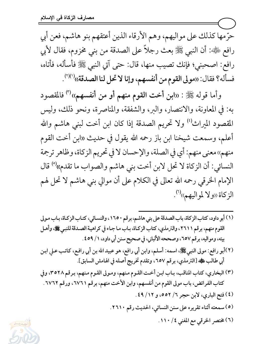 (¬1) أبو داود، كتاب الزكاة، باب الصدقة على بني هاشم، برقم 1650، والنسائي، كتاب الزكاة، باب مولى القوم منهم، برقم 2611، والترمذي، كتاب الزكاة، باب ما جاء في كراهية الصدقة للنبي - صلى الله عليه وسلم -، وأهل بيته، ومواليه، برقم 657، وصححه الألباني، في صحيح سنن أبي داود، 1/ 459.