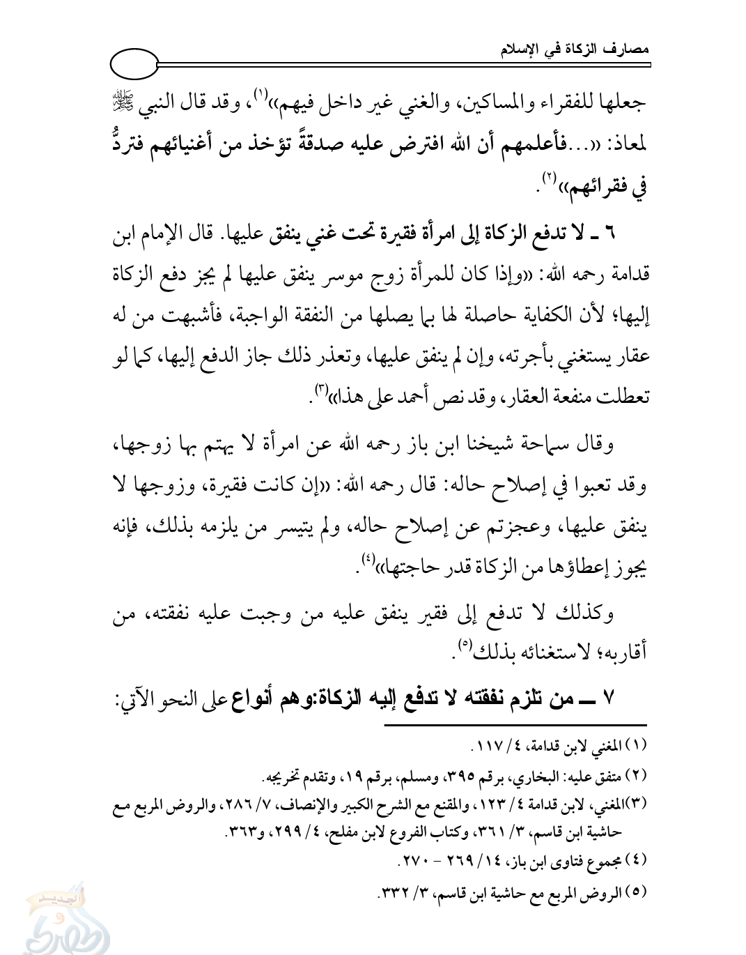 7 - من تلزم نفقته لا تدفع إليه الزكاة: وهم أنواع على النحو الآتي: