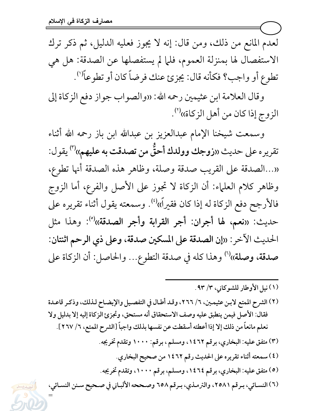وسمعت شيخنا الإمام عبدالعزيز بن عبدالله ابن باز رحمه الله أثناء تقريره على حديث ((زوجك وولدك أحقُّ من تصدقت به عليهم)) (¬3) يقول: (( ... الصدقة على القريب صدقة وصلة، وظاهر هذه الصدقة أنها تطوع، وظاهر كلام العلماء: أن الزكاة لا تجوز على الأصل والفرع، أما الزوج فالأرجح دفع الزكاة له إذا كان فقيراً)) (¬4). وسمعته يقول أثناء تقريره على حديث: ((نعم، لها أجران: أجر القرابة وأجر الصدقة)) (¬5): وهذا مثل الحديث الآخر: ((إن الصدقة على المسكين صدقة، وعلى ذي الرحم اثنتان: صدقة، وصلة)) (¬6) وهذا كله في صدقة التطوع ... والحاصل: أن الزكاة على