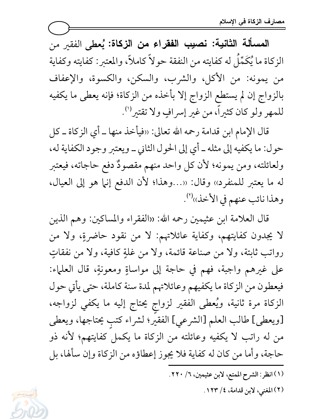 المسألة الثانية: نصيب الفقراء من الزكاة: يُعطى الفقير من الزكاة ما يُكَمِّلُ له كفايته من النفقة حولاً كاملاً، والمعتبر: كفايته وكفاية من يمونه: من الأكل، والشرب، والسكن، والكسوة، والإعفاف بالزواج إن لم يستطع الزواج إلا بأخذه من الزكاة؛ فإنه يعطى ما يكفيه للمهر ولو كان كثيراً، من غير إسرافٍ ولا تقتير (¬1).