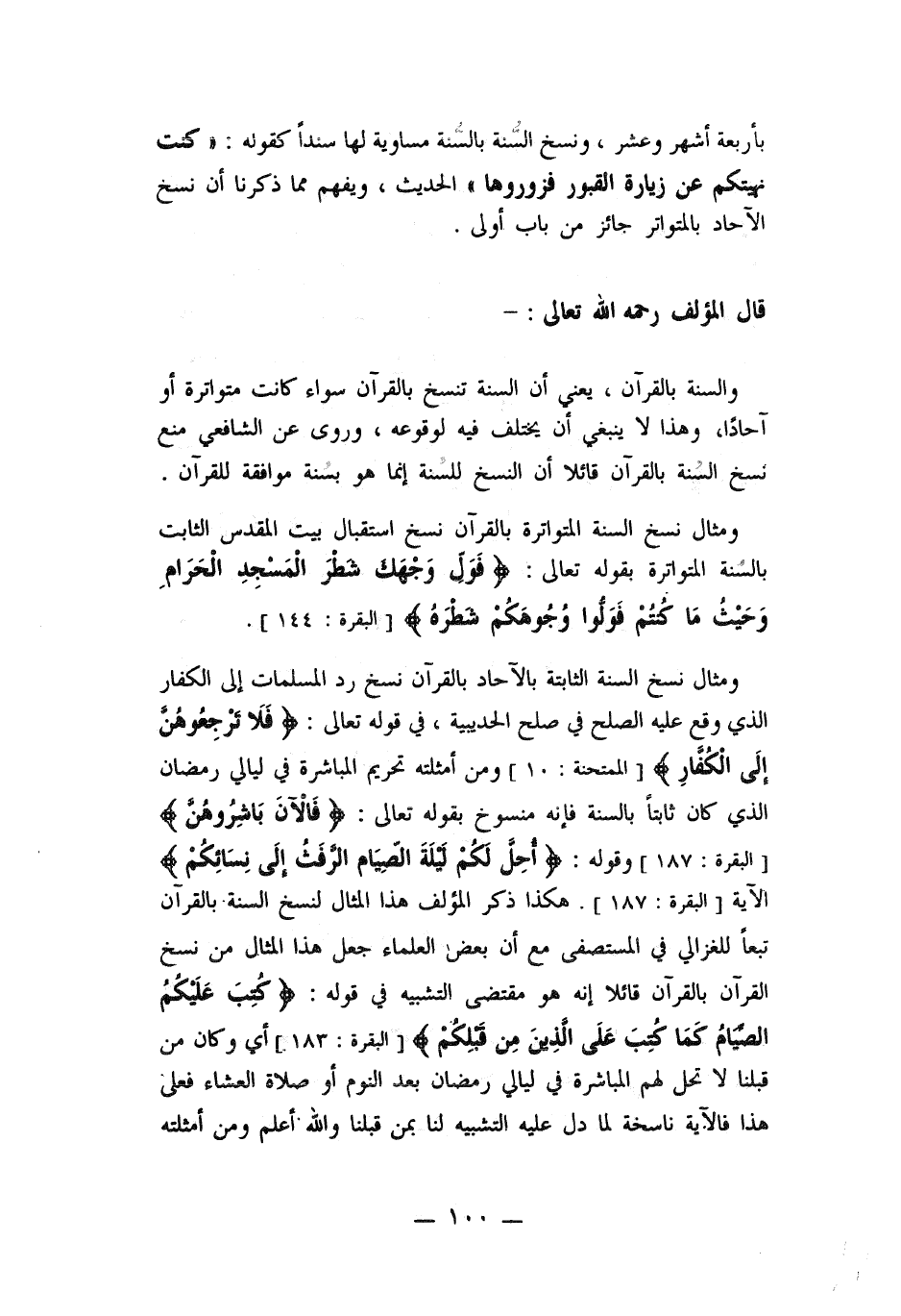 ومثال نسخ السنة المتواترة بالقرآن نسخ استقبال بيت المقدس الثابت بالسنة المتواترة بقوله تعالى: " فول وجهك شطر المسجد الحرام وحيث ما كنتم فولوا وجوهكم شطره ".