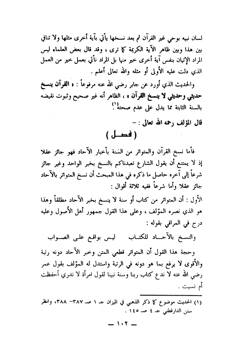 الأول: ان المتواتر من كتاب أو سنة لا ينسخ بخبر الآحاد مطلقاً وهذا هو الذي نصره المؤلف، وعلى هذا القول جمهور أهل الأصول وعليه درج في المراقي بقوله: