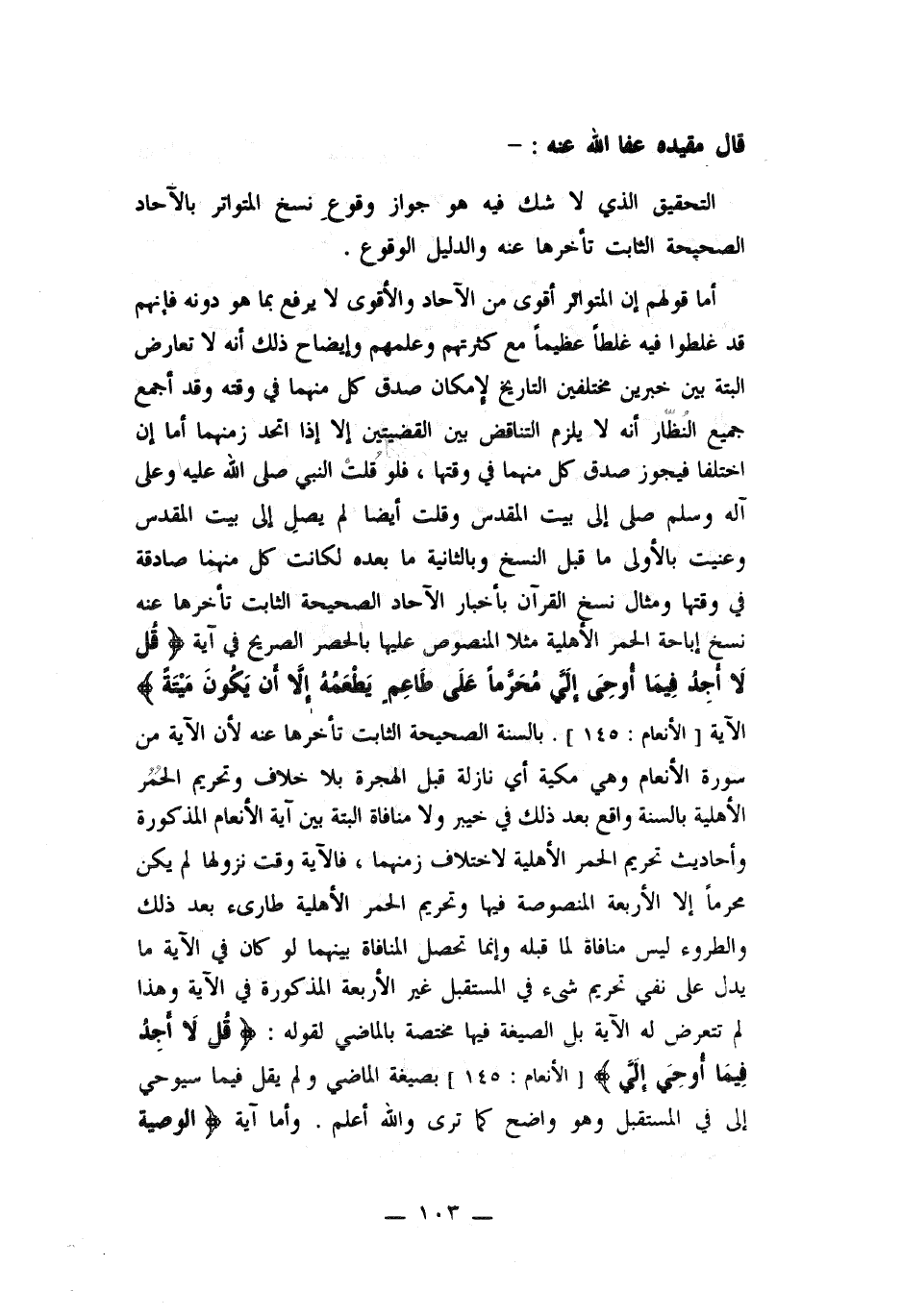 بأخبار الآحاد الصحيحة الثابت تأخرها عنه نسخ اباحة الحمر الأهلية مثلاً المنصوص عليها بالحصر الصريح في آية " قل لا أجد فيما أوحي إلي محرماً على طاعم يطعمه الا أن يكون ميتة " الآية. بالسنة الصحيحة الثابت تأخرها عنه لأن الآية من سورة الأنعام وهي مكية أي نازلة قبل الهجرة بلا خلاف وتحريم الحمر الأهلية بالسنة واقع بعد ذلك في خيبر ولا منافاة البتة بين آية الأنعام المذكورة وأحاديث تحريم الحمر الأهلية لاختلاف زمنهما، فالآية وقت نزولها لم يكن محرماً إلا الأربعة المنصوصة فيها وتحريم الحمر الأهلية طارئ