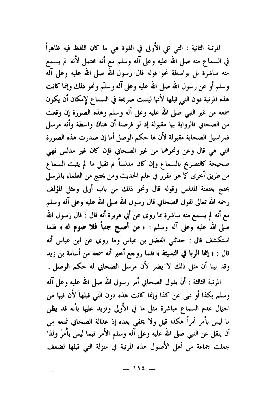 المرتبة الثانية التي تلي الأولى في القوة هي ما كان اللفظ فيه ظاهراً في السماع منه - صلى الله عليه وسلم - مع أنه محتمل لأنه لم يسمع منه مباشرة بل بواسطة نحو قوله قال رسول الله - صلى الله عليه وسلم - أو عن رسول الله - صلى الله عليه وسلم - ونحو ذلك وانما كانت هذه المرتبة دون التي قبلها لأنها ليست صريحة في السماع لامكان أن يكون سمعه من غير النبي - صلى الله عليه وسلم - وهذه الصورة ان وقعت من الصحابي فالرواية بها مقبولة اذ لو فرضنا أن هناك واسطة وأنه مرسل